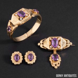 Bracelet, Broche et Boucles d’oreilles en or, améthystes, perles fines – Vers 1850