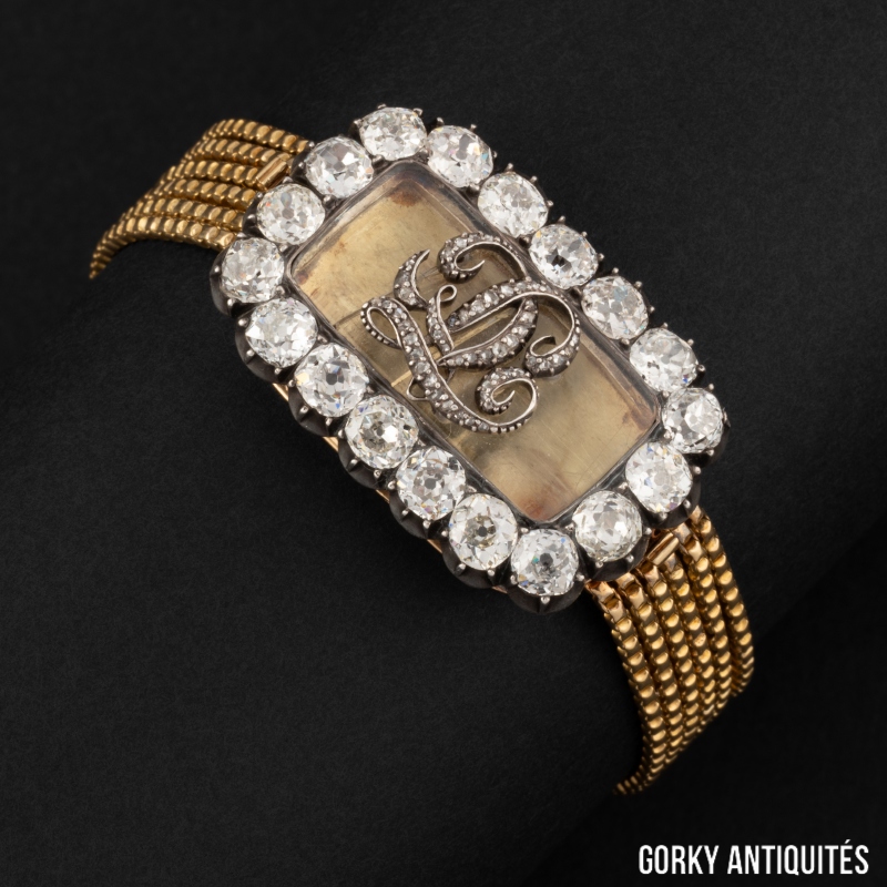 Bracelet « souvenir » composé d’un médaillon en or et argent, chiffré « VL » sur un verre, entouré de diamants de taille ancienne et attaché de six chaines en or. Le dos gravé « COMTESSE de VALLIN née LA GUICHE 1845 » Poids: 22,3g. Vers 1845