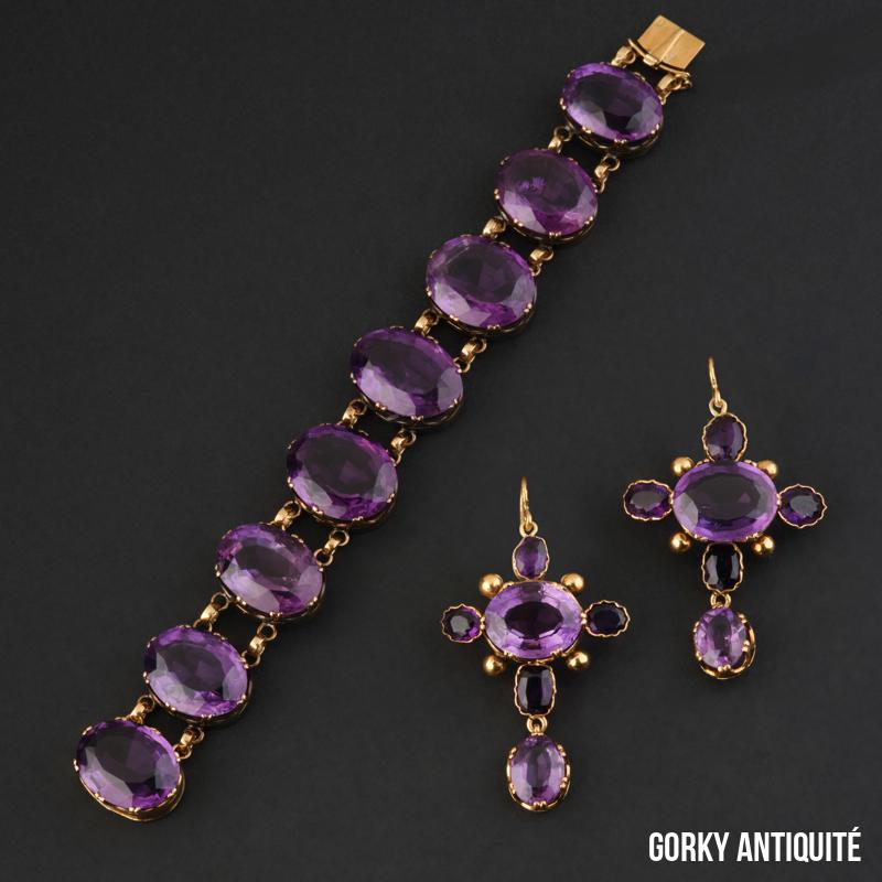 Parure en or, composée d’un bracelet et d’une paire de pendants d’oreilles ornés d’améthystes. Poids: 48, 7g. Vers 1870 Second Empire