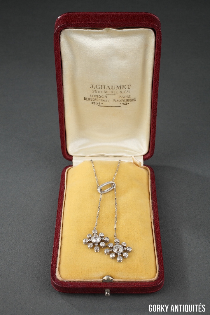 Collier « négligé » en platine, orné de diamants de taille ancienne. Poids : 7g Vers 1930 Dans son écrin d’origine signé CHAUMET Ref. : A2111