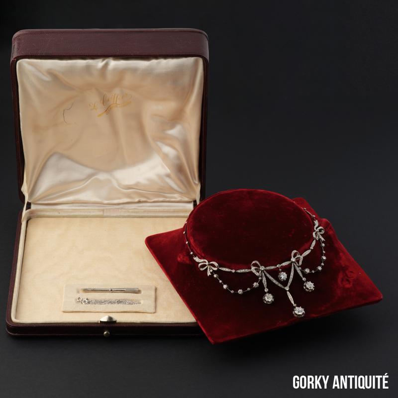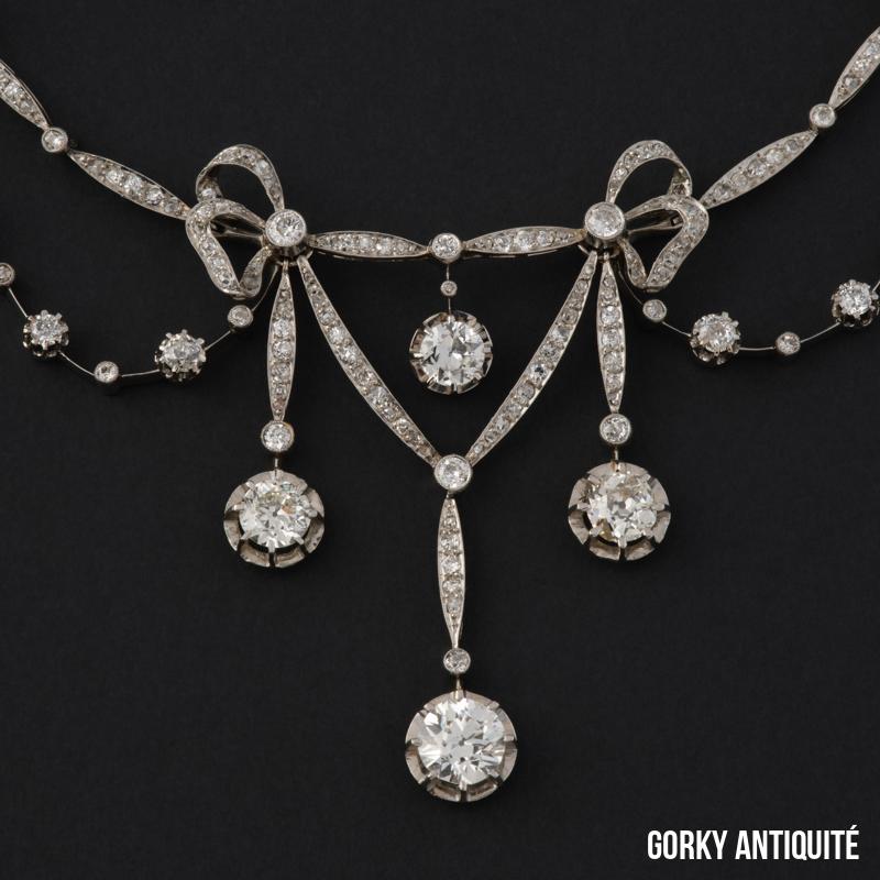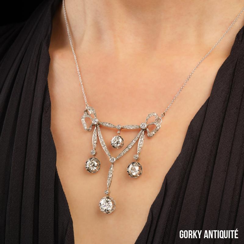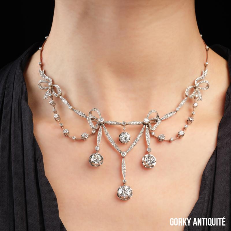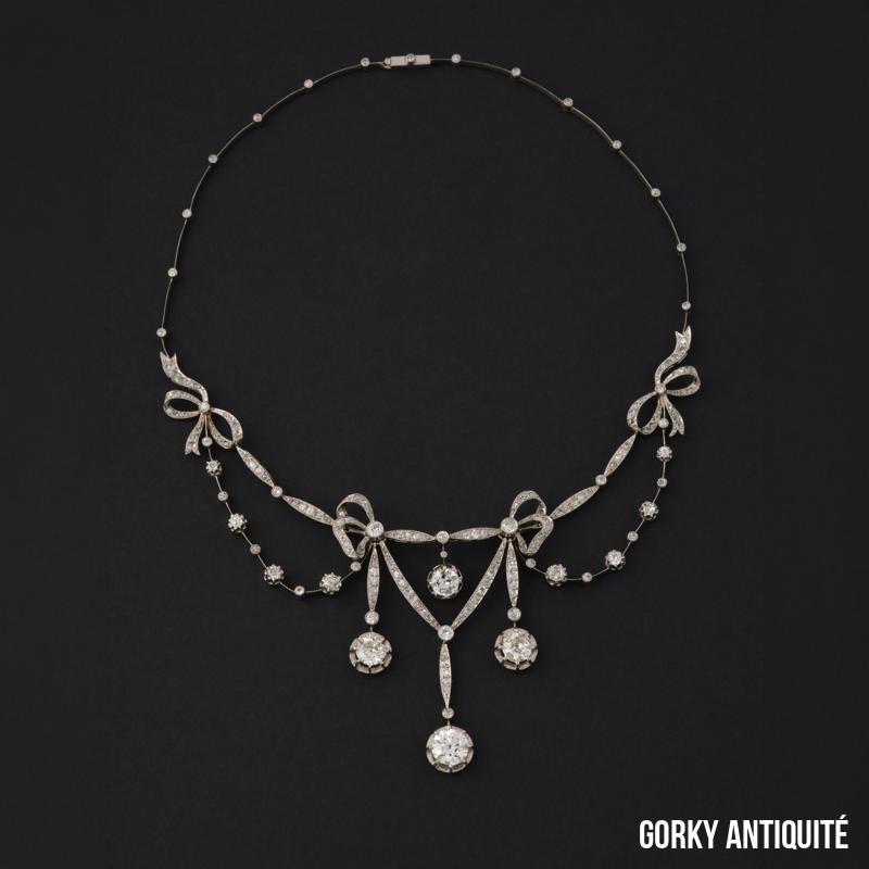 Collier « draperie »en platine, dans un décor de nœuds, orné de diamants de taille ancienne et taillés en rose.
