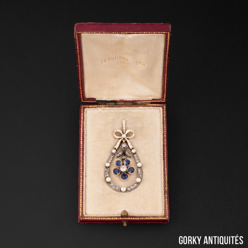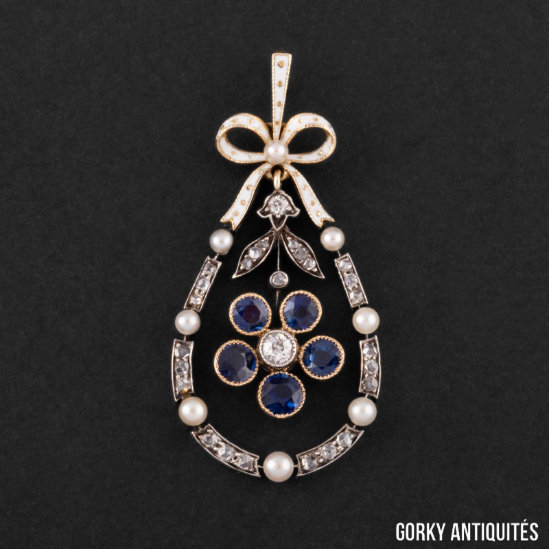 Pendentif en or 14k et argent « priforme », orne d’un nœud émail blanc, le contour alterné de diamants taillés en rose et de perles, au centre une pampille mobile,sertie d’un diamant, entouré de saphirs.