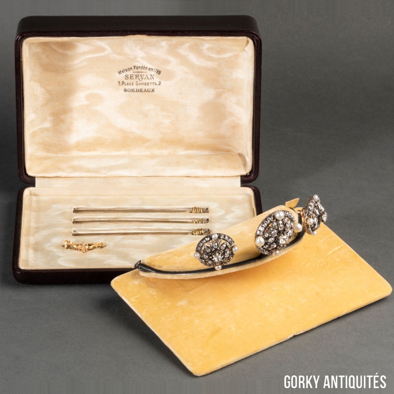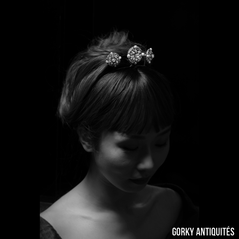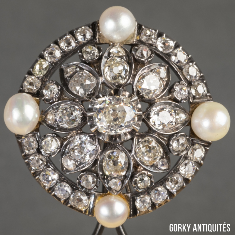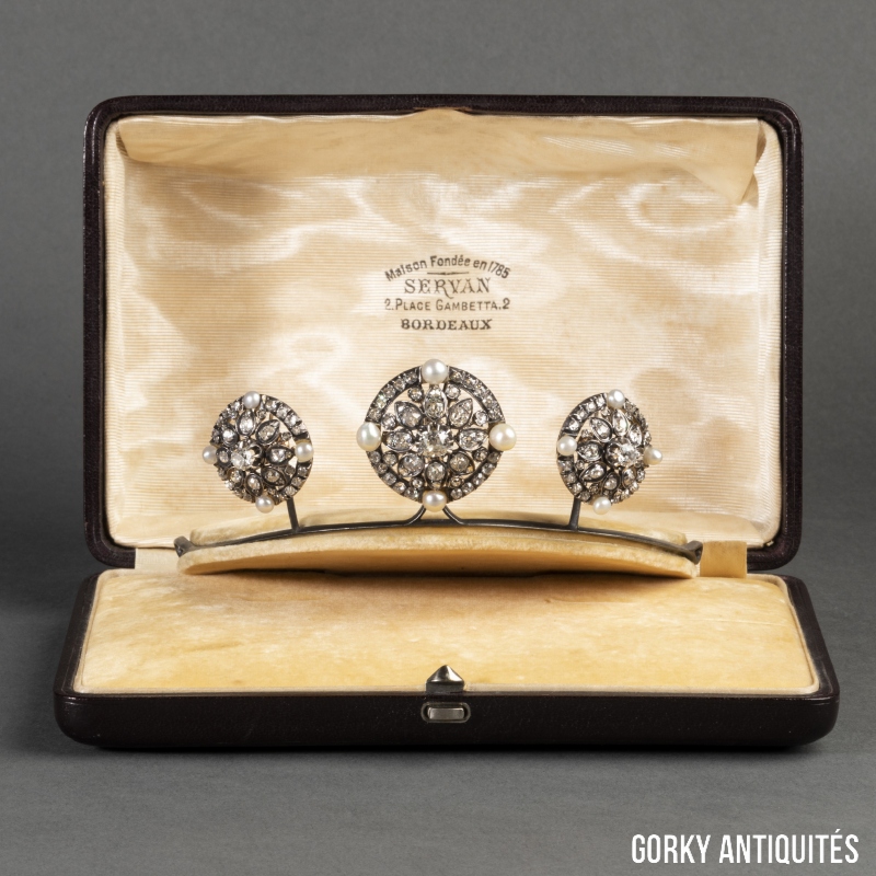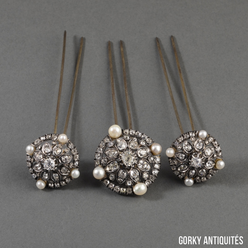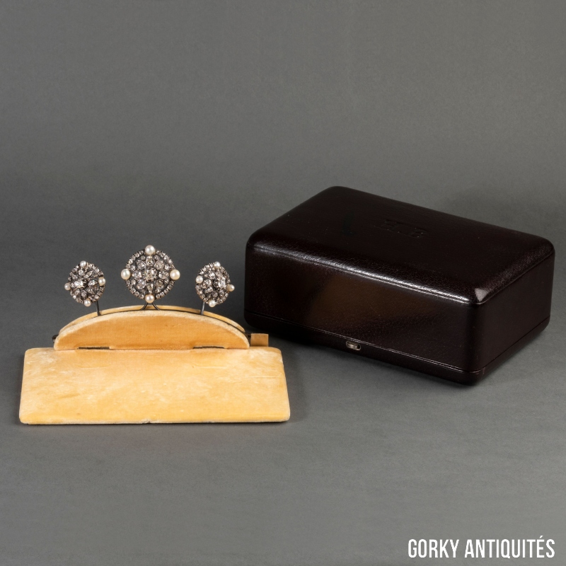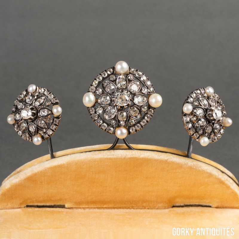 Tiare en métal, orné de trois rosaces en or et argent, serties de diamants de taille ancienne, de taillés en rose et de perles.